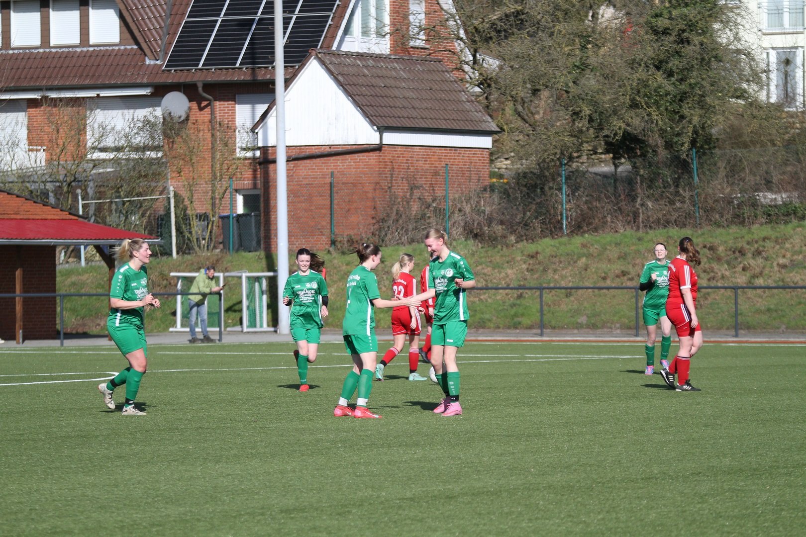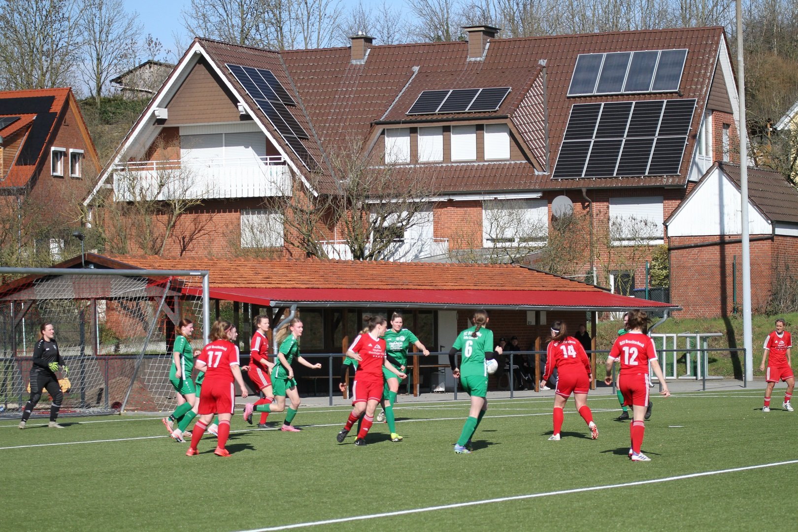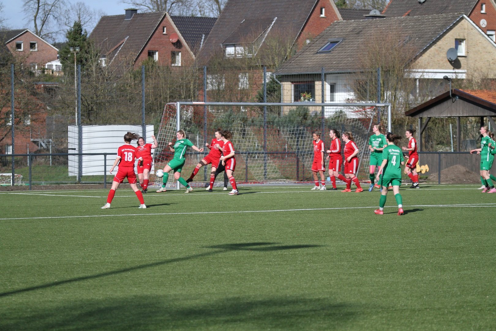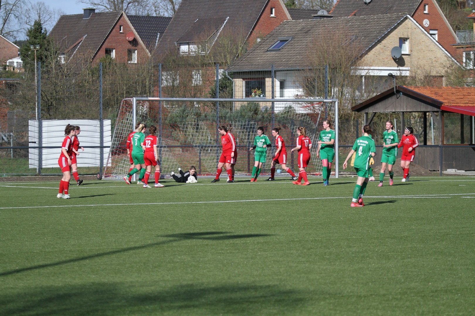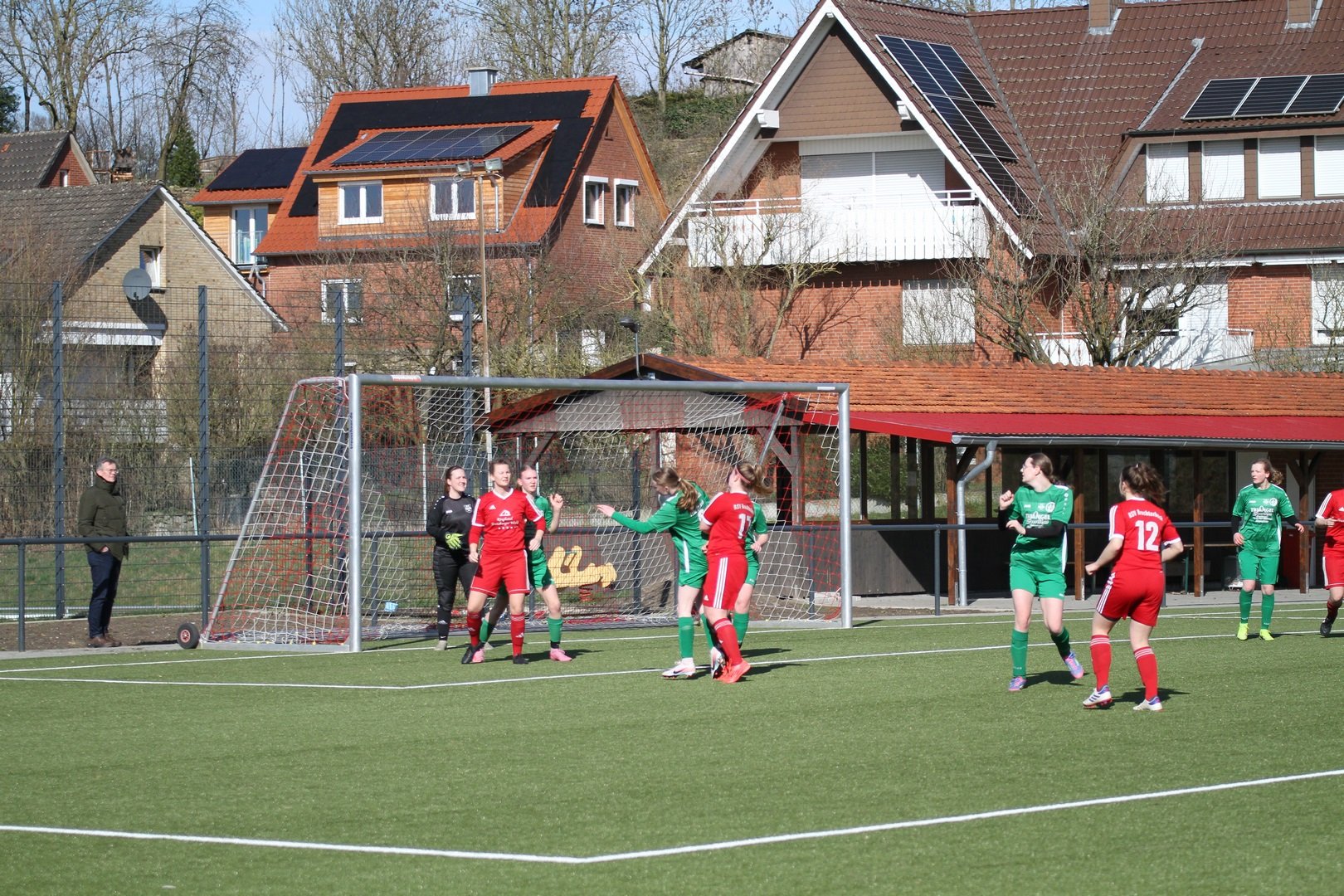 Die Rollen waren klar verteilt aber vorab war klar, dass es keine eindeutige Sacher werden wird. Unsere Damen SG hat sich verstärkt und stark verjüngt. Das war vor allem läuferisch in der Partie zu spüren. Zunächst stand unsere Damen SG in den ersten Minuten etwas passiver und es sah ein wenig danach aus als wenn der Respekt ein wenig Hemmungen auslöste. Dieses gab sich aber nach gut 20 Minuten und unsere Damen wurden spielfreudiger und mutiger. Während dem Gastgeber die Anfangsphase gehörte wurde unsere Mannschaft ab der 20. Minute besser und machte dem BSV Probleme. Nach 35 Minuten sorgte dann ein schöner Schuss aus der zweiten Reihe durch Katharina Engeler für die Führung der SG Dörenthe/Saerbeck. Darauf hatte der Gastgeber zunächst auch keine Antwort. Brochterbeck tat sich sehr schwer gegen die laufstarken jungen Spielerinnen unserer SG. Auch spielerisch zeigte unsere SG gutes Passspiel. Der letzte Pass wollte aber nicht ankommen. Defensiv zeigten beide Mannschaften eine starke Leistung. Spielerisch in der Zentralen war unsere SG aber etwas besser. Auch in der zweiten Halbzeit war die SG Dörenthe/Saerbeck dem 2:0 näher als der BSV dem Ausgleich. Dem Gastgeber blieb nichts anderes übrig als komplett aufzulösen, um noch einen Punkt mitzunehmen. Aus dem Spiel heraus brachte der Gastgeber aber nichts auf das Tor unserer Damen. Bei Eckstößen wurde es aber immer brenzlich. Nach einer umstrittenen Freistoßentscheidung führte Brochterbeck schnell aus und unsere Damen verpassten die Situation. Da musste auf der Linie gerettet werden. Unsere Damen ließen die eine oder andere Kontergelegenheit aus. Für den Ausgleich in der 87. Minute sorgte ein schnell ausgeführter Eckstoß, den Anja Korte auf den Kasten brachte. Unsere Torfrau Elisabeth Wermers wehrte den Ball an die Latte ab, dieser prallte aber zurück an den Kopf und ins Tor. Kurios und glücklich aber letztlich der Lohn der kurzen Drangphase des Gastgebers der Risiko gegangen war. Unterm Strich ein glücklicher Punkt für Brochterbeck was auch seitens des BSV so gesehen wurde und ein BigPoint für unsere Damen. Unsere Damen SG hat gezeigt das zukünftig mit Ihr zu rechen ist. Ein tolles faires Spiel bei schönem Wetter.